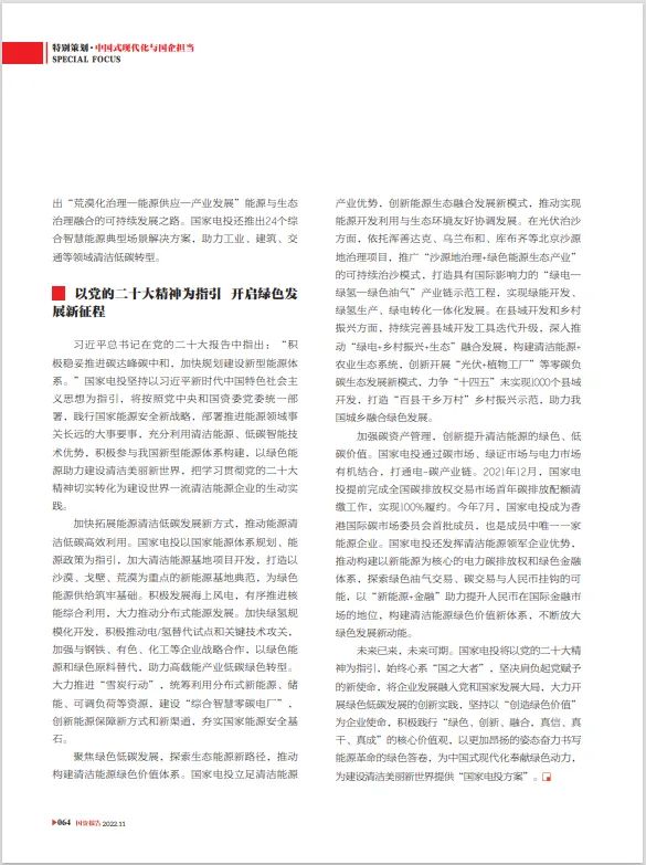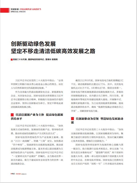 《国资报告》11期刊发集团公司党组书记、董事长钱智民署名文章《创新驱动绿色发展 坚定不移走清洁低碳高效发展之路》。文章紧紧围绕党的二十大报告精神,紧密联系企业绿色低碳转型发展实践,畅谈贯彻落实举措和路径方向,积极展现出企业奋力书写能源革命绿色答卷的昂扬姿态。以下为报道全文: