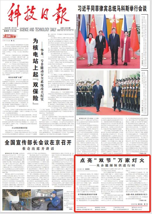 1月5日,《科技日报》总第12355期头版刊发《点亮“双节”万家灯火——央企能源保供进行时》一文。文章介绍了“暖核一号”核能供热项目在智慧清洁供暖方面的良好实践。报道称,“暖核一号”核能供热项目进入第四个供暖季。该核能供热项目正在为海阳市全城区500万平方米的20万居民“零碳”供暖,这是我国最大的核能供热项目,海阳市也是全国首个“零碳”供暖城市。以下为报道全文: