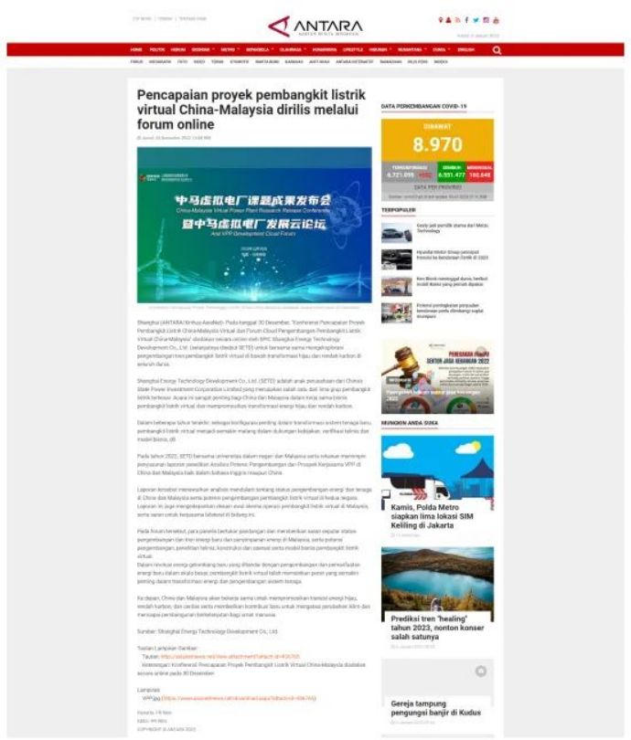 1月5日,新华社客户端刊发《刷屏!海外百余家媒体聚焦中马虚拟电厂合作发展》一文。报道称,近日由上海能科主办的“中马虚拟电厂课题成果发布会暨中马虚拟电厂发展云论坛”,受到了全球10多个国家及百余家全球媒体的广泛关注,被马新社、印报托、印尼安塔拉、越通社等国家通讯社直接发布,超过百余家网站刊登转载,活动内容传播范围覆盖马来西亚、泰国、印度、印尼、越南、菲律宾等亚太地区11个国家。以下为报道全文: