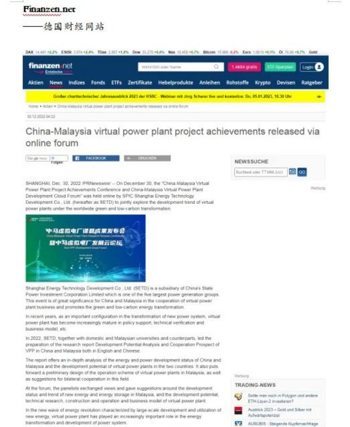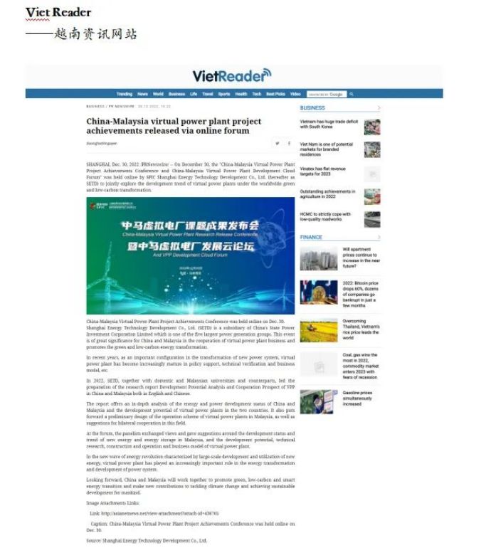 多国媒体在报道中提到线上论坛中发布的中英文《中马虚拟电厂开发潜力分析与合作展望》课题研究成果。该研究成果是由上海能科牵头与东南大学、马来西亚彭亨大学、马来西亚太阳能资源公司、马来西亚桂和集团联合编制,它深入分析了中马两国能源与电力发展现状和中马两国虚拟电厂开发潜力,初步设计了马来西亚虚拟电厂运行方案,提出了中马两国在虚拟电厂产业合作发展的建议,这对中马两国未来的虚拟电厂合作的开展有着积极的影响。