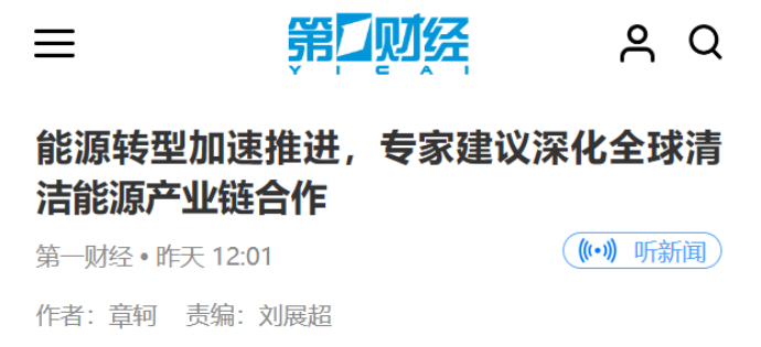 9月11日,第一财经客户端刊发《能源转型加速推进,专家建议深化全球清洁能源产业链合作》一文。报道称,能源改革创新必须要围绕好“加快建设新型能源体系”和“构建新型电力系统”两个主题,着重关注产业链、供应链、创新链的对接。近年来,内蒙古公司通辽发电厂积极探索向清洁能源转型的新途径,在灰场上建‘蓝海’‘绿洲’,变废为宝,治灰治沙,改善了当地的生态环境。据测算,这座光伏电站每年可节约标煤8万余吨,减少排放二氧化碳约21万余吨、氮氧化物约800吨、二氧化硫约600吨、烟尘约100吨、灰渣3万余吨,向社会贡献清洁电力10.13亿千瓦时。以下为报道全文: