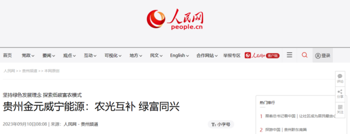 9月10日,人民网刊发《坚持绿色发展理念 探索低碳富农模式?贵州金元威宁能源:农光互补 绿富同兴》一文。报道称,板上发电、板下种植,这是贵州威宁自治县探索的光伏+农业新模式:将太阳能发电组件与农业设施、农业种植养殖相结合,在山地间采用高支架和大间距布置光伏阵列,并利用光伏板下空间种植生长条件适宜的粮食化农作物,形成融合互补之势。成为当地推动“工业反哺农业、农业赋能工业”有益循环的生动实践。以下为报道全文: