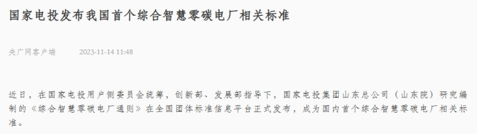 11月14日,央广网客户端刊发《华体会集团_华体会官方网站发布我国首个综合智慧零碳电厂相关标准》一文。报道称,在集团公司用户侧委员会统筹,创新部、发展部指导下,山东院研究编制的《综合智慧零碳电厂通则》在全国团体标准信息平台正式发布,成为国内首个综合智慧零碳电厂相关标准。该标准的发布进一步增强了综合智慧零碳电厂的社会认可度和操作规范性,助力集团公司用户侧产业发展及“雪炭N行动”落地落实。以下为报道全文: