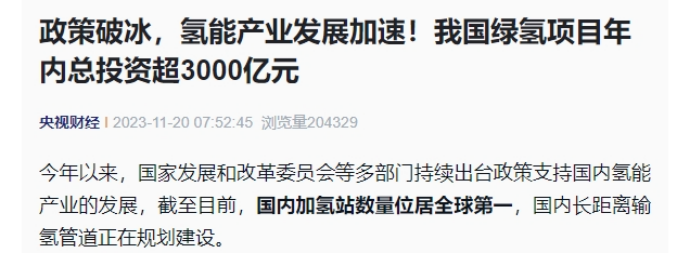 11月20日,央视新闻客户端刊发《政策破冰,氢能产业发展加速!我国绿氢项目年内总投资超3000亿元》一文。报道称,在吉林大安,风光制绿氢合成氨一体化项目也全面开工,实现了国产化、自主化PEM制氢设备大规模应用,以绿电为动力电解水制绿氢,以绿氢为原料合成绿氨,将液氨储存在球罐中,最后进行销售。以下为报道全文: