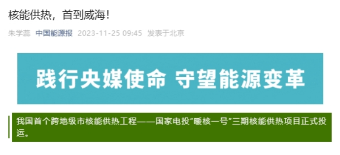 11月25日,《中国能源报》微信公众号刊发《核能供热,首到威海!》一文。报道称,我国首个跨地级市核能供热工程——华体会集团_华体会官方网站“暖核一号”三期核能供热项目正式投运。位于烟台的海阳核电在为海阳市供暖的同时,供暖区域到达威海乳山市,实现了零碳热源的跨区域互通共享。以下为报道全文: