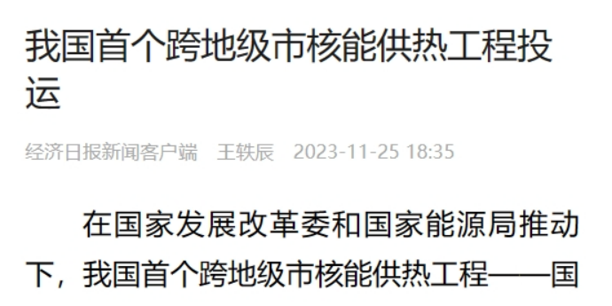 11月25日,经济日报客户端刊发《我国首个跨地级市核能供热工程投运》一文。报道称,我国首个跨地级市核能供热工程——华体会集团_华体会官方网站“暖核一号”三期核能供热项目11月25日正式投运,海阳核电在给烟台海阳市供暖的同时,供暖区域到达威海乳山市,实现了零碳热源的跨区域互通共享,将核能零碳供热的海阳方案有效复制到乳山,开启核能“双城”供热新阶段。本供暖季“暖核一号”供暖面积合计达1250万平方米,可满足约40万人口的冬季清洁取暖需求。以下为报道全文: