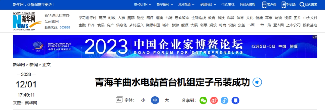近日,新华社、光明网、中国青年网等多家媒体报道《青海羊曲水电站首台机组定子吊装成功》一文。报道称,黄河公司建设的羊曲水电站首台(2号)机组定子11月30日吊装成功,标志着羊曲水电站机电安装工作取得阶段性胜利,为电站实现2024年8月首台机组投产发电目标奠定了基础,该水电站位于青海省海南藏族自治州兴海县和贵南县交界处的黄河干流上,是青海省清洁能源外送通道的重要支撑调峰电源。电站总装机容量120万千瓦,平均年发电量约47.32亿千瓦时。以下为报道全文: