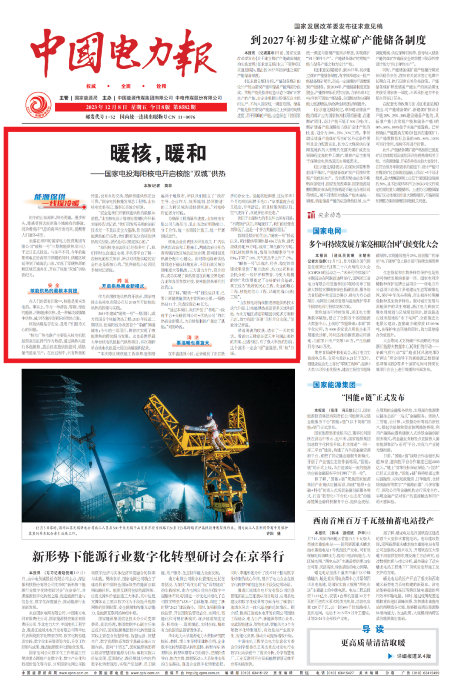 12月8日,《中国电力报》头版头条刊发《暖核,暖和——华体会集团_华体会官方网站海阳核电开启核能“双城”供热》一文。报道称,“暖核一号”三期核能供热项目已于近日正式投运,与往年不同的是今年的海阳核电在给海阳市供暖的同时,供暖区域延伸到了威海乳山市,实现了零碳热源的跨区域互通共享,开启了核能“双城”供热新纪元。以下为报道全文: