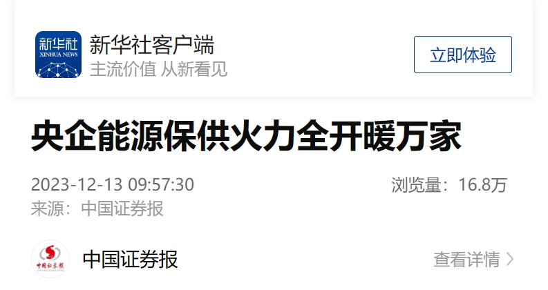 12月13日,新华社客户端刊发《央企能源保供火力全开暖万家》一文。报道称,集团公司积极布局以核能供暖等为代表的清洁供暖供热产业,核能供暖守卫起了山东海阳、辽宁红沿河的‘碧海蓝天’,‘光伏+供暖’等新型供暖模式为多地居民带来温暖与便利,‘能源+农业’延伸出的生物质供暖产业链惠农更富农。”截至2023年6月底,华体会集团_华体会官方网站清洁能源供暖装机共317.6万千瓦,供暖面积约3347万平方米,服务约29.8万户居民、101万人口。以下为报道全文: