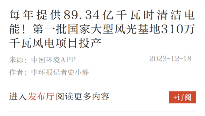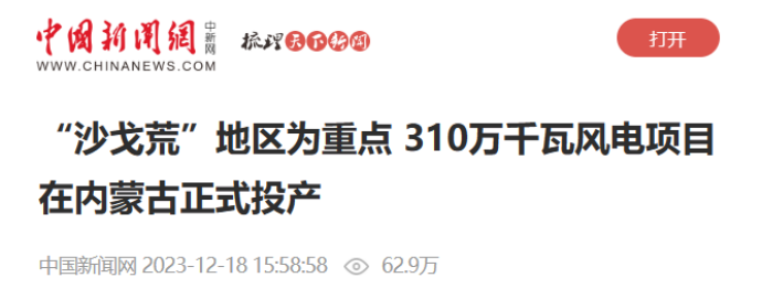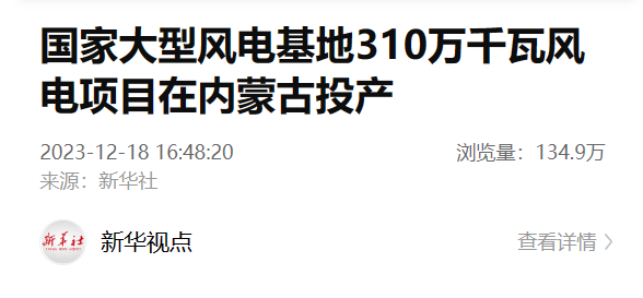 12月18日,人民日报、新华社、中国新闻社、第一财经等多家媒体报道《国家大型风电基地310万千瓦风电项目在内蒙古投产》一文。报道称,作为“十四五”时期第一批国家大型风光基地中由内蒙古公司投资建设的310万千瓦风电项目已正式投产,该项目投产后,每年可提供89.34亿千瓦时清洁电能、节约282.12万吨标煤、减少753.91万吨二氧化碳排放量,有助于推动内蒙古能源转型。以下为报道全文: