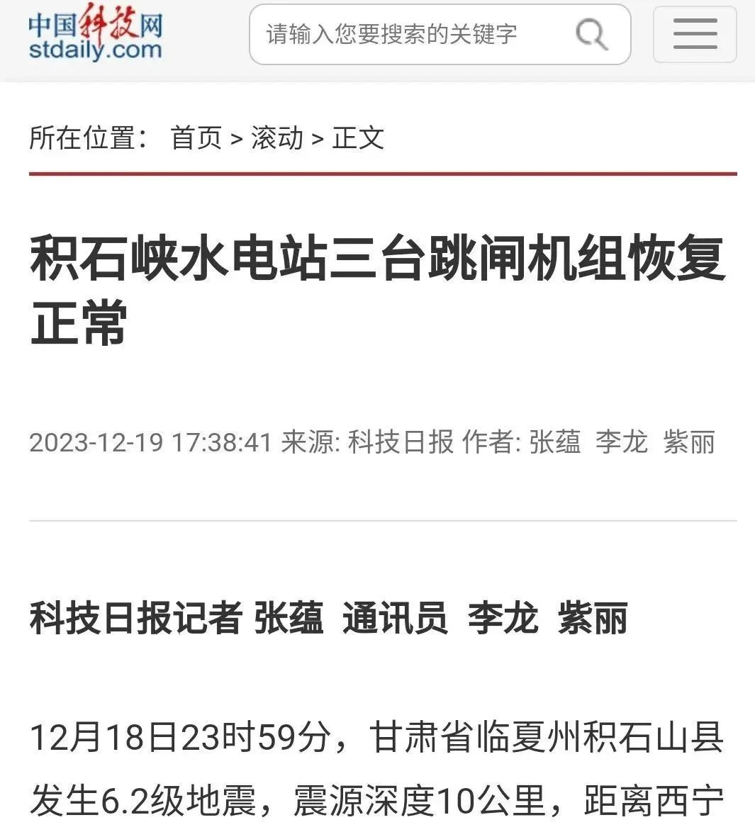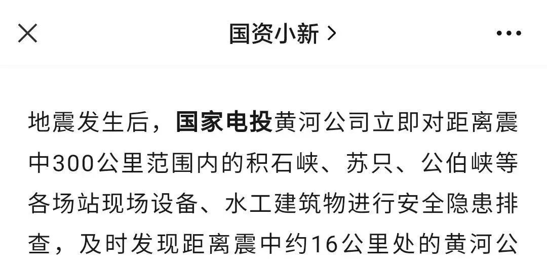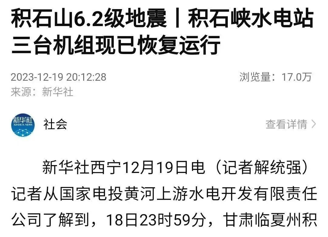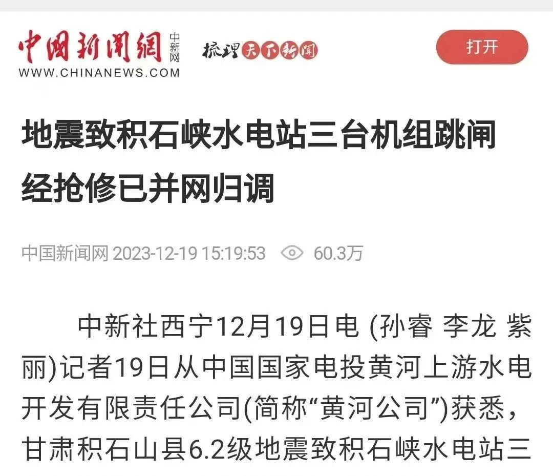 12月19日,新华社、《工人日报》、中国新闻网、《科技日报》、国资小新公众号等多家媒体刊发《积石峡水电站三台跳闸机组恢复正常》一文。报道称,导致距离震中约16公里处的黄河公司积石峡水电站三台机组全部跳闸、孟清线330KV送出线路跳闸,经过抢修目前电站三台机组已全部并网归调,各设备运行正常,电站运行平稳。以下为报道全文: