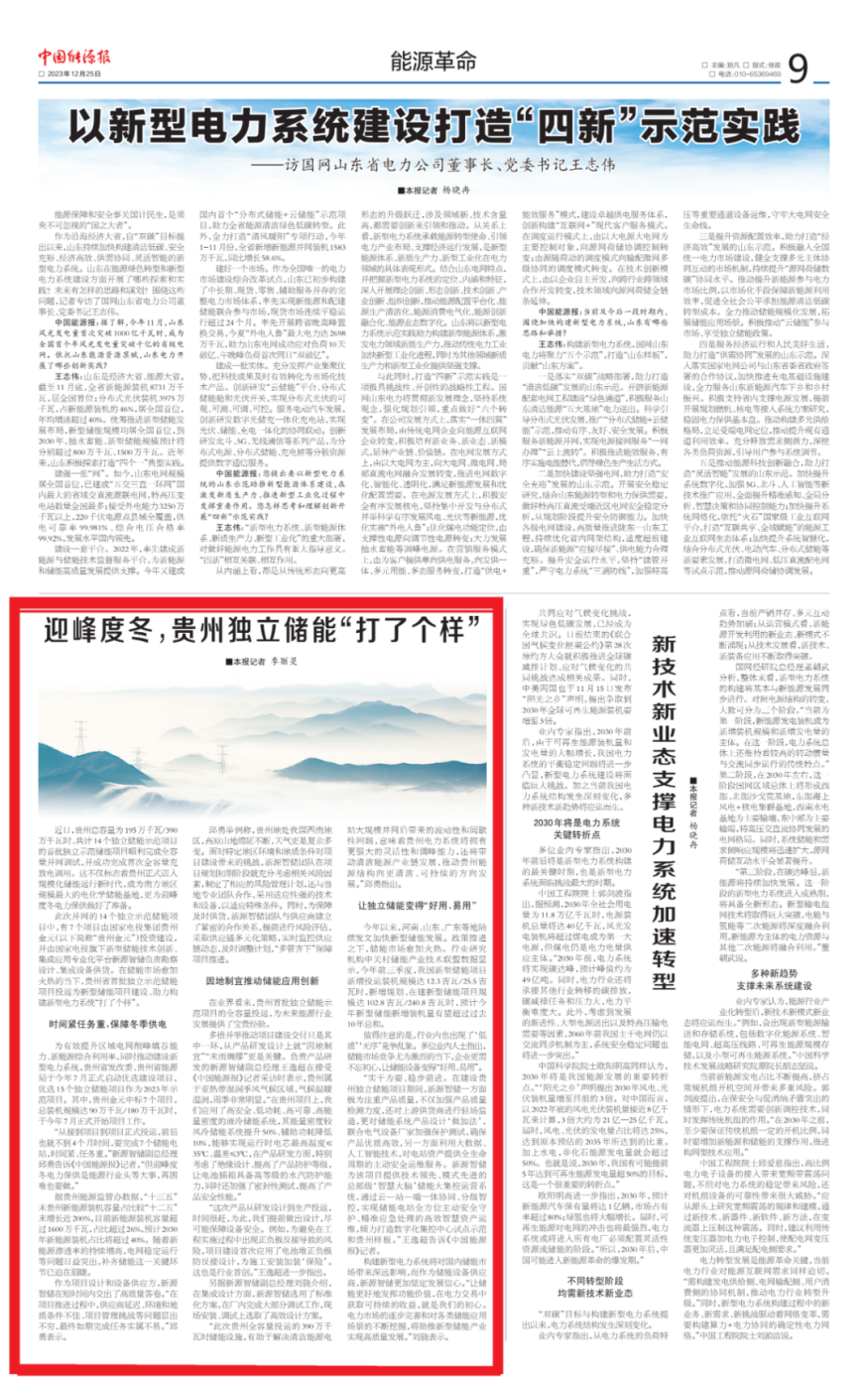 12月25日,《中国能源报》刊发《迎峰度冬,贵州独立储能“打了个样”》一文。报道称,贵州总容量为195万千瓦/390万千瓦时、共计14个独立储能示范项目的首批独立示范储能项目顺利完成全容量并网调试,并成功完成首次全容量充放电调用。此次并网的14个独立示范储能项目中,有7个项目由贵州金元投资建设,并由新型储能技术创新、集成应用专业化平台新源智储负责勘察设计、集成设备供货,在储能市场愈加火热的当下,贵州省首批独立示范储能项目投运为新型储能项目建设、助力构建新型电力系统“打了个样”。以下为报道全文: