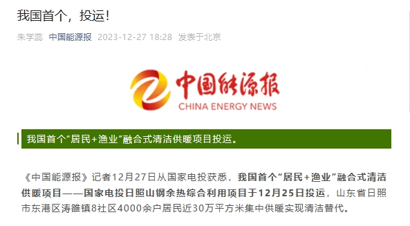 12月27日,《中国能源报》官方微信公众号刊发《我国首个,投运!》一文。报道称,我国首个“居民+渔业”融合式清洁供暖项目——集团公司日照山钢余热综合利用项目于12月25日投运,该项目等效容量149.34兆瓦,年总供热量220.1万吉焦,全容量投运后,预计可满足涛雒镇近30万平方米集中供暖和120万平方米渔业养殖水体保温需求,每年可节省标煤8.58万吨,减排二氧化碳23万吨。以下为报道全文: