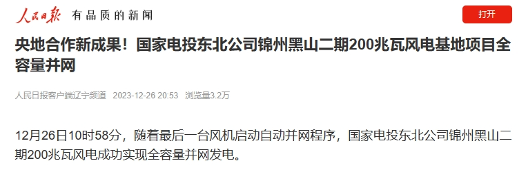 12月26日,人民日报客户端刊发《央地合作新成果!华体会集团_华体会官方网站东北公司锦州黑山二期200兆瓦风电基地项目全容量并网》一文。报道称,集团公司与辽宁省政府深化央地战略合作的重大清洁能源工程,东北公司打造锦州地区“新能源+绿电转化”创新示范基地的重点支撑项目,总投资达12.51亿元,共建设40台5兆瓦风力发电机组,与黑山一期400兆瓦风电项目共用升压站。项目全容量并网后,每年可向电网输送5.2亿千瓦时清洁电力,每年可节约标煤约17.1万吨、减排二氧化碳约45.7万吨,具有显著的经济效益和生态环保效益,对促进当地能源结构绿色低碳转型、推动区域经济社会高质量可持续发展具有重要意义。以下为报道全文:
