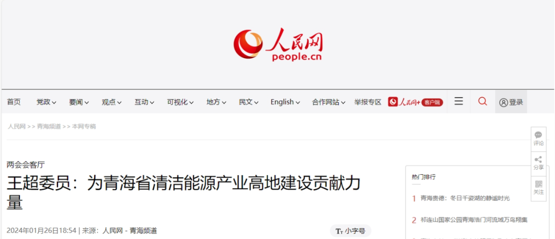 1月26日,人民网刊发《两会会客厅 王超委员:为青海省清洁能源产业高地建设贡献力量》一文。报道称,2024年青海两会召开期间,人民网专访青海省政协委员、青海省投党委书记、董事长王超。王超表示,站在新起点上,全面助推生态文明高地和“四地”建设,就必须以只争朝夕的紧迫感真抓实干,让美好蓝图变成生动现实。以下为报道全文: