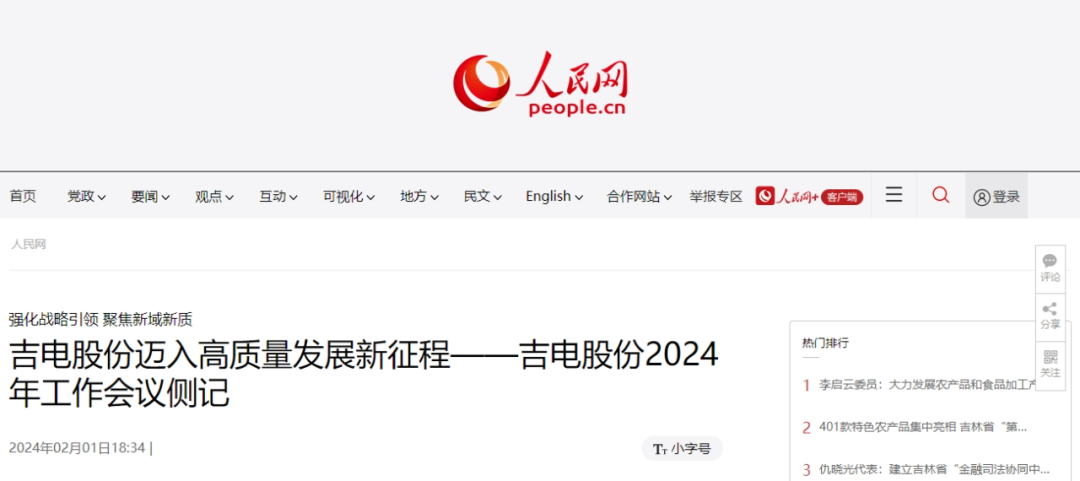 2月1日,人民网刊发《强化战略引领 聚焦新域新质 吉电股份迈入高质量发展新征程》一文。报道称,吉电股份作为国家“双碳”战略矢志不渝的践行者,坚持深耕吉林和全国化发展并行的全局战略,保持战略定力,强抓战略机遇,锚定世界一流目标不放松,超前谋划布局,抢占优质资源,加快实施、落地见效、保持领先。以更加务实的态度、更加有力的措施、更加创新的思维,全面开启向一流产业和一流企业进军的新征程。以下为报道全文: