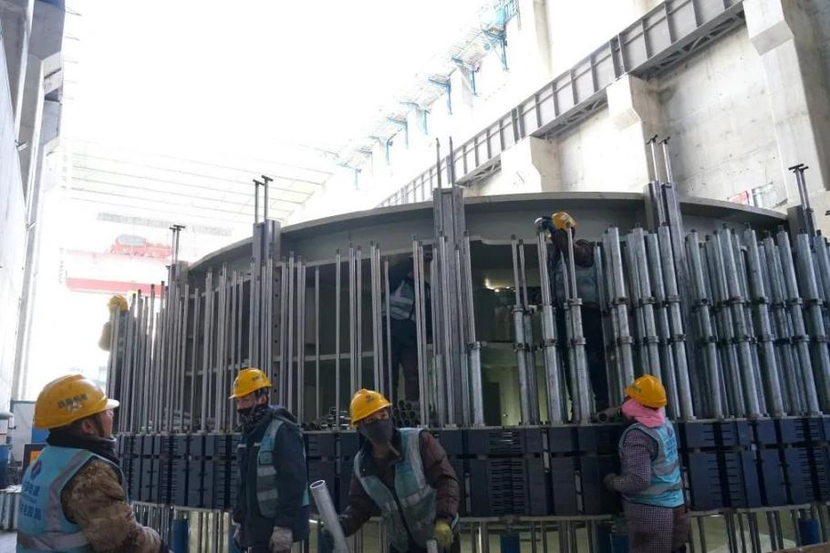 在安装车间,2号机组转子磁轭冲片的叠装工作正有条不紊地进行。水电四局机电安装分局羊曲项目部发电机转子班工人正将9600多张43公斤重、3毫米厚的磁轭冲片,分810层叠成一张“千层蛋糕”。这个“千层蛋糕”直径超过12米,高约3米,制作这张巨型“千层蛋糕”则需要考验机电安装工人的“绣花功夫”。