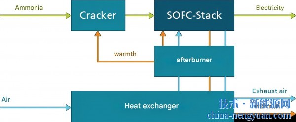 在这个过程中,氨首先被调节并送入裂化装置,在那里它被加热到300摄氏度或更高的温度。作为反应,它分解成氢(H2)和氮(N2)。当这个过程完成后,氮可以简单地与水蒸气一起作为无害的废气释放出来。然后,氢气被送入高温燃料电池(SOFC)。在陶瓷电解质中,它流过阳极,而气流流过阴极。氢分裂释放出从阳极到阴极的电子。电流就是这样开始流动的。除了水蒸气,这种电化学反应还产生热能。这些热量被用来保持裂解炉内部的高温,一部分作为废热释放出来,能够用于某些目的。