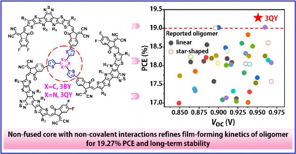 上述研究明确了多臂寡聚物受体的结构-性能内在关系,提出了基于非稠合核心的新型寡聚受体设计策略,为高效且稳定的有机太阳能电池研究提供了新思路。
