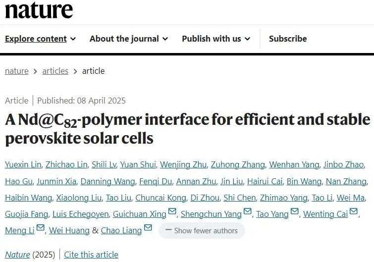 富勒烯作为一种碳的同素异形体,具有高效电子传导特性。“该研究相当于给钙钛矿太阳能电池,穿上了一件名为‘富勒烯—聚合物偶联层’的‘超级铠甲’,在它里面织着足球状的‘富勒烯’这一神奇材料,从而实现电子的高效传导。”林智超说,同时,他们还在富勒烯材料里内嵌了磁性Nd原子(金属钕),就像加了个“电动小马达”,让电子传输得更快更稳。