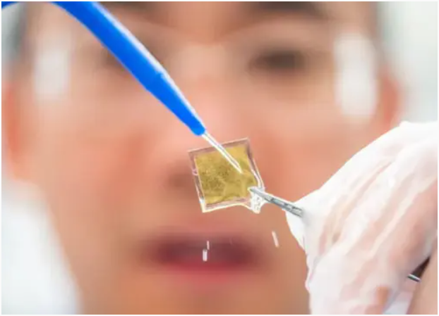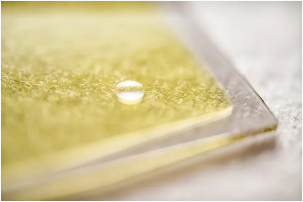 ▲用于生产氢燃料的三层太阳能材料的特写,其中一滴水突出了其反应表面。图片来源:林雪平大学/Olov Planthaber