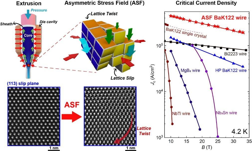 针对该难题,研究团队创新提出“非对称应力场”调控策略,采用规模化挤压成形技术,协同调控静水压力与剪切应力,成功在脆性超导晶格中诱导出高密度、有序排列的位错结构,形成高效磁通钉扎中心,显著提升了材料在强磁场下的电流承载能力。