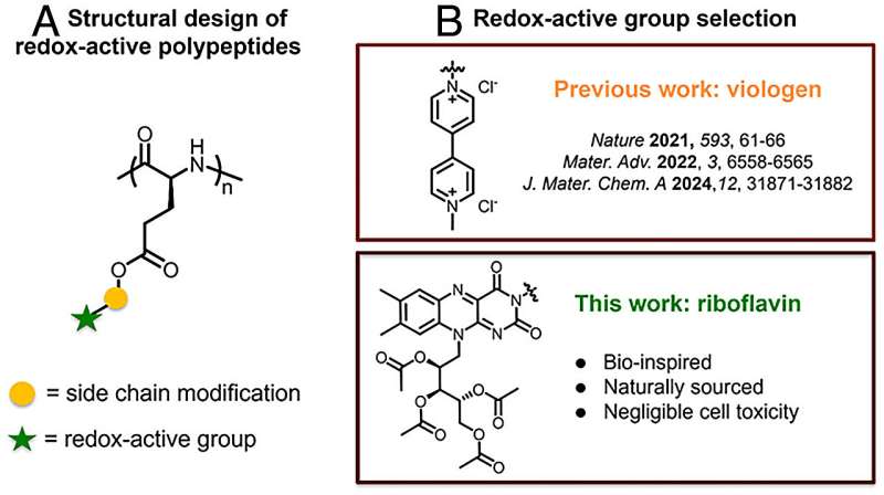 这种新材料由自然界中的两种关键成分制成,即核黄素(维生素B2)和L-谷氨酸(有助于人体蛋白质合成的氨基酸)。这些成分由应届博士毕业生李世国发现,他旨在提高有机聚合物电池中生物可再生构件含量,开发出将分子构件连接成多肽链状结构的合成方法。该材料具有氧化还原活性,可获得和失去电子,这正是电池储存和释放能量的方式,其中核黄素负责处理能量,多肽提供结构并帮助材料自然分解。