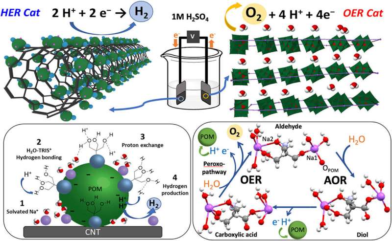 研究团队将一种钒簇与碳纳米管结合,形成混合材料。团队负责人玛丽亚·希门尼斯-洛佩兹指出:“关键不在于金属簇本身,而在于其周围有机阳离子的排列方式。” 当材料与纳米管物理混合时,被称为TRIS的阳离子被锁定在晶体结构中,促使反应通过特定氧化机制产生氧气。而当材料以定向方式组装时,同样的阳离子被释放并朝向表面,起到捕获质子的作用,从而使系统转变为高效的产氢催化剂。