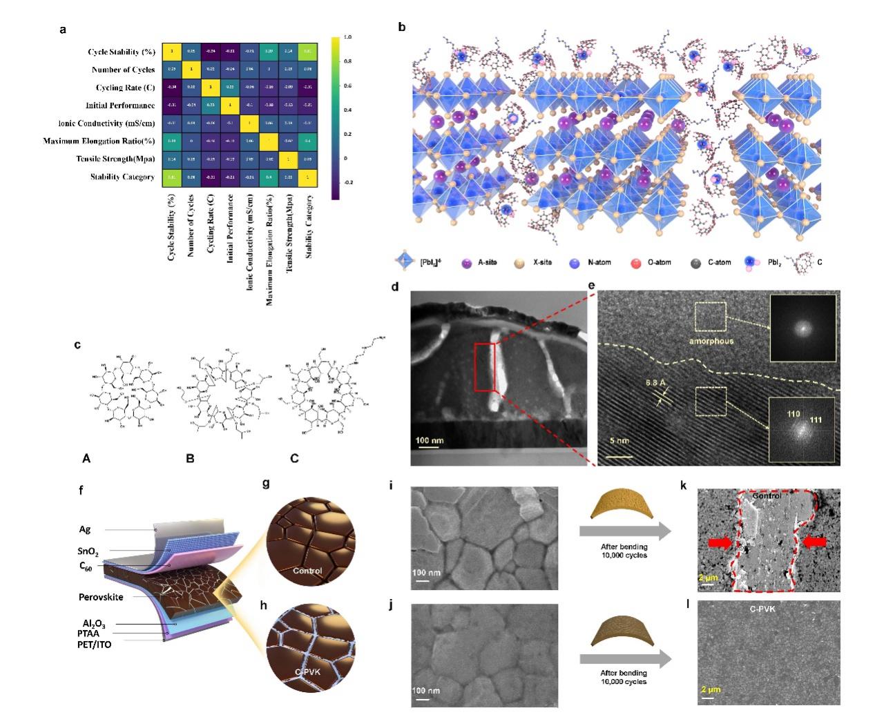 传统钙钛矿太阳能电池在性能提升中常依赖PbI2或低维钙钛矿钝化。然而,PbI2能级单一且高度结晶易破坏界面,低维钙钛矿则可能因有机组分扩散而导致长期工作失效,且在弯折应力会导致PbI2/低维钙钛矿这些晶态材料的性能发生变化。研究团队创新性地采用主-客体材料与Pb-I构建非晶复合钝化层,通过分子设计实现能级调控,并保持材料在弯折和长期使用中的稳定性。