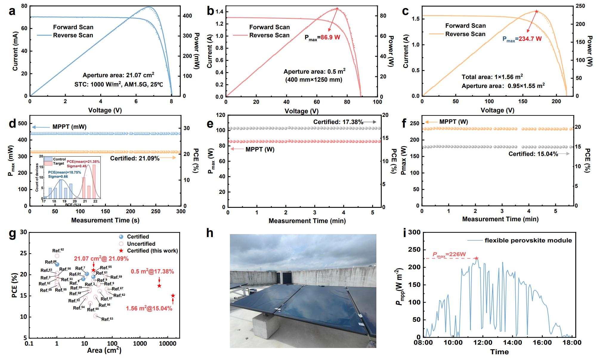 基于此策略,研究团队实现柔性电池24.52%转换效率,10000次弯折后仍保持92.5%初始效率。团队还制备了大面积柔性组件,0.5m2组件输出功率86.9W,1.4725m2组件输出功率226W,单位质量功率达558W˙kg-1。此前柔性组件最大尺寸在100cm2级别,而此次柔性组件首次突破了平米级制造的难题,并开始户外部署,为走向应用迈出了关键一步。