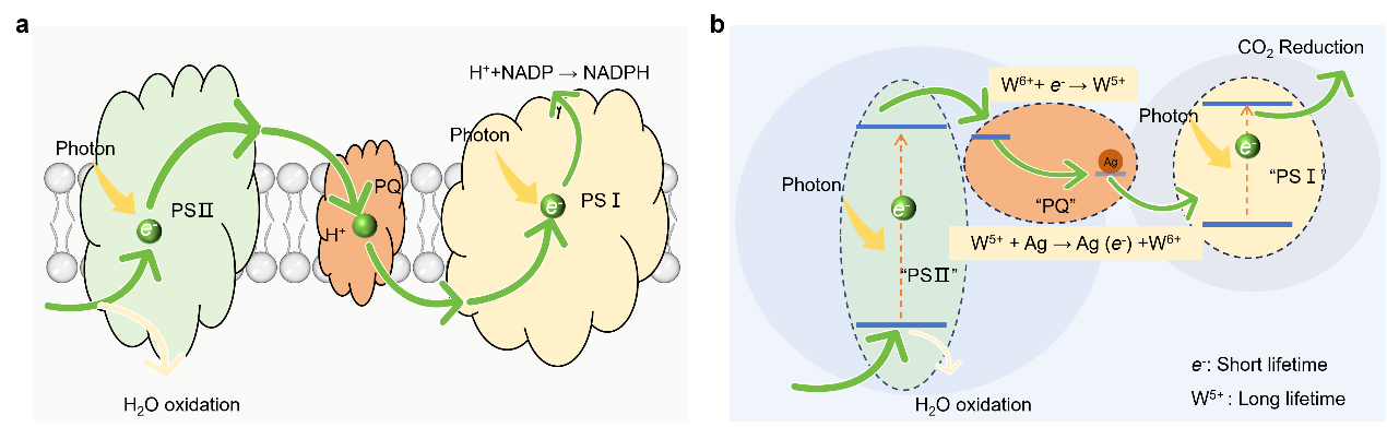植物通过光合作用,巧妙地将结构简单的二氧化碳和水转化为复杂的养分分子,为人类借助化学手段实现温室气体二氧化碳的资源化利用提供了自然范例。然而,人工模拟光合作用的过程仍面临科学挑战,其关键瓶颈在于:光激发功能材料所产生的电子(用于还原二氧化碳)与空穴(用于氧化水)寿命极短,难以实现二者反应的同步与持续进行。
