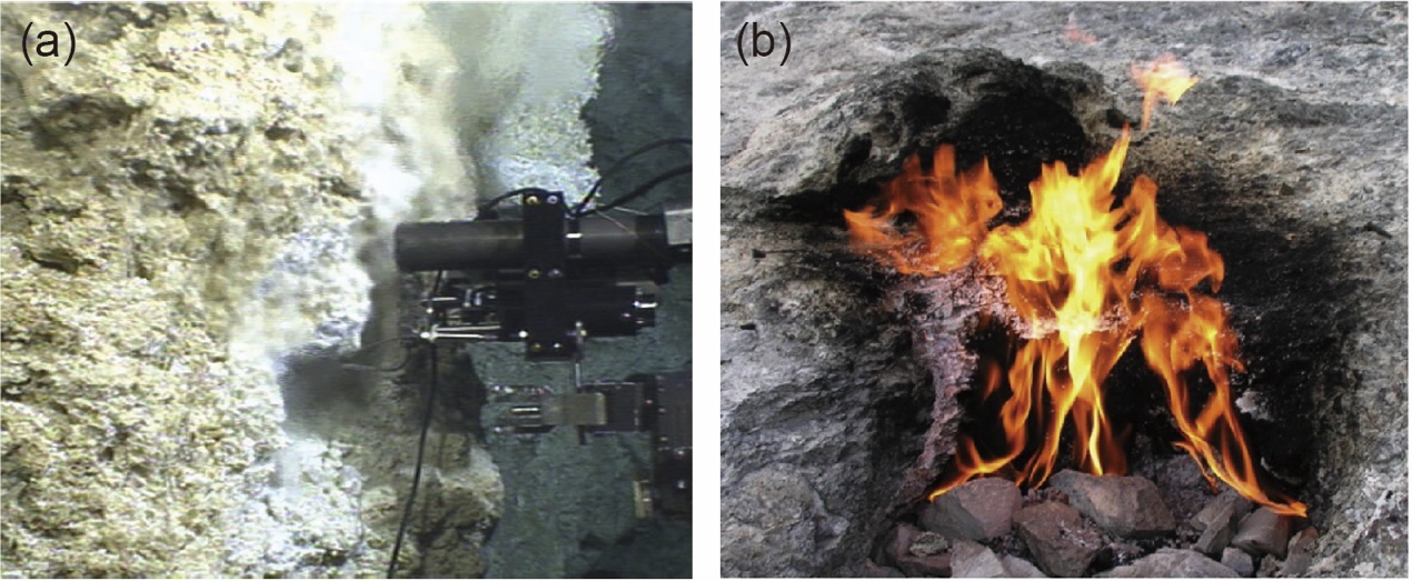 大洋中脊海底富含天然氢气的热液喷口与蛇绿岩中富含天然氢气的气苗。地质地球所供图
