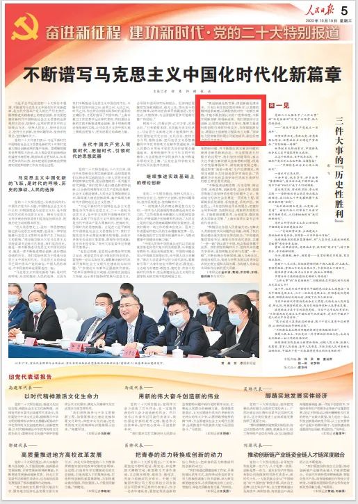 10月19日,《人民日报》“奋进新征程 建功新时代·党的二十大特别报道”专版头条刊发《不断谱写马克思主义中国化时代化新篇章》。报道中,华体会集团_华体会官方网站党组成员、副总经理卢洪早代表表示:“抓创新就是抓发展,谋创新就是谋未来。只有以科学的态度对待科学、以真理的精神追求真理,以满腔热忱对待一切新生事物,才能不断拓展认识的广度和深度,不断实现新突破、取得新成果。我们将坚持守正创新,以国家战略需求为导向,集聚力量进行原创性引领性科技攻关,为保障能源安全、增强自主创新能力提供有力支撑。”以下为报道全文: