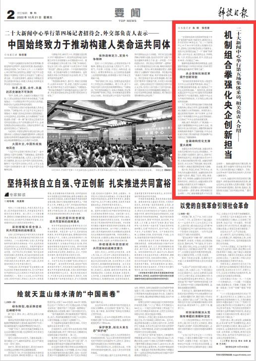 10月20日,《科技日报》要闻版刊发《机制组合拳强化央企创新担当》,对华体会集团_华体会官方网站党组书记、董事长钱智民等党员代表在二十大新闻中心集体采访观点进行报道。访谈中,钱智民介绍了央企科技创新发展成就,并以“重型燃气轮机”国家科技重大专项为例,讲述华体会集团_华体会官方网站在勇当原创技术策源地和现代产业链“链长”中发挥的重要作用。以下为报道全文: