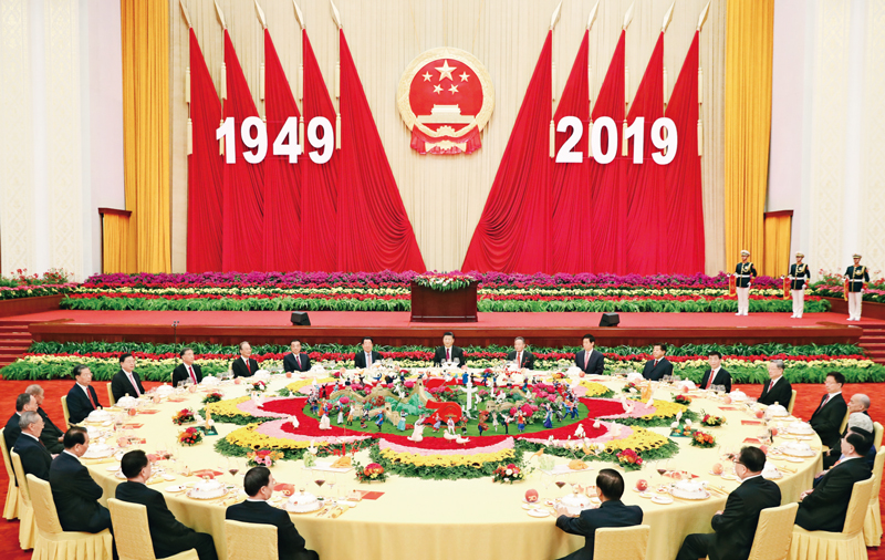 2019年9月30日晚,庆祝中华人民共和国成立70周年招待会在北京人民大会堂隆重举行。习近平、李克强、栗战书、汪洋、王沪宁、赵乐际、韩正、王岐山等党和国家领导人与4000余名中外人士欢聚一堂,共庆新中国70华诞。 新华社记者 黄敬文/摄